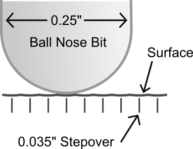 Our tool path software cuts parts in a full sheet bi-directional raster pattern which appears as a zig zag over the surface of the stock material. Our default step over (distance between each pass of the router bit) is 0.035” or 0.889mm with a 0.25” ball nose bit.